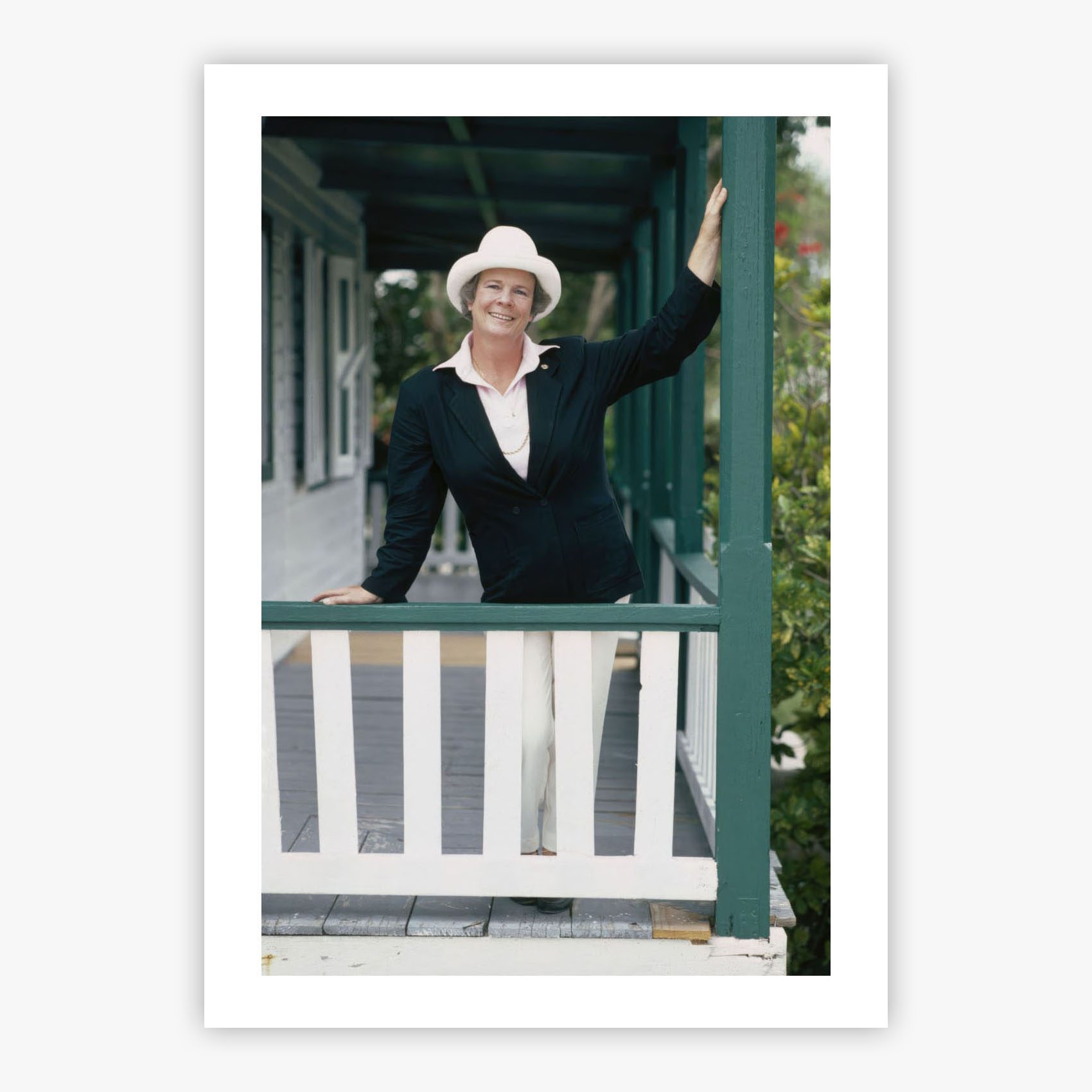Marsh Harbour Porch captures a quintessential moment of Bahamian leisure through Slim Aarons' discerning lens, photographed in March 1986 on Great Abaco Island. Penny Turtle, the vivacious coordinator for Boat Harbour Marina, relaxes on a sun-drenched porch overlooking the turquoise waters of Marsh Harbour, embodying the effortless elegance that defined island life in the mid-1980s. The composition balances tropical architecture, natural light, and unhurried sophistication, creating a visual narrative that transports viewers to this idyllic sanctuary where time moves at its own leisurely pace.